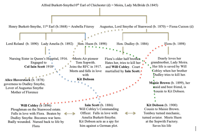 This book tells the story of Katherine (Kit) Dobson – cousin to Flora Smythe’s maid, Maisie Brown. Kit was born in 1900 and exiled at the age of twelve from Stanwood and its environs when her father moves to Surrey to take over his uncle’s garage. She returns finally to the village in 1918 as an unsung war heroine, a fully-fledged pilot and an aeronautical engineer. As in Volume One the story develops on multiple levels. One subsidiary strand of this book deals with the origin in 1868 of Henry The Earl of Chichester’s, hatred for his brother, Lord Augustus of Stanwood. The other strand tells the story of how Dudley teams up with his uncle (Henry Burkett-Smythe, Earl of Chichester), to try and ruin Lord Augustus’ reputation in order that he and his uncle will inherit the Stanwood estate.
